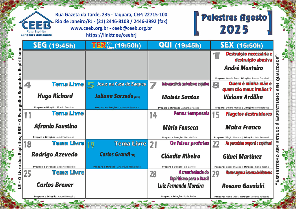 Clique nos documentos abaixo para ver/baixar os programas completos de reuniões públicas de estudo doutrinário e de passes na Sede e nos Núcleos Vila Sapê e Chico Xavier.